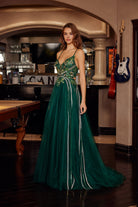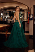 LONG TULLE FIT AND FLARE GOWN WITH PLUNGING V NECKLINE NXG1795