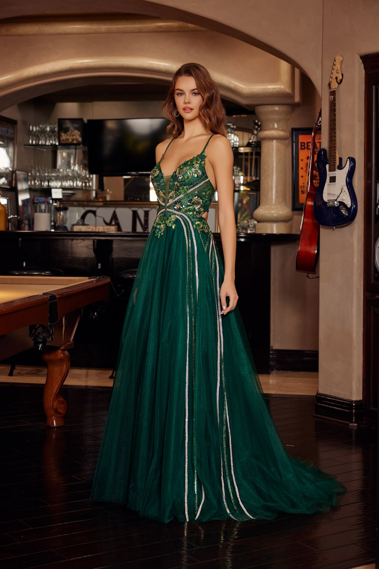 FIT AND FLARE LONG TULLE GOWN WITH PLUNGING V NECKLINE SPAGHETTI STRAPS SHEER WAISTLINE COLORFUL SEQUINED EMBROIDERED BODICE CRISSCROSS BACK AND SWEEPING TRAIN