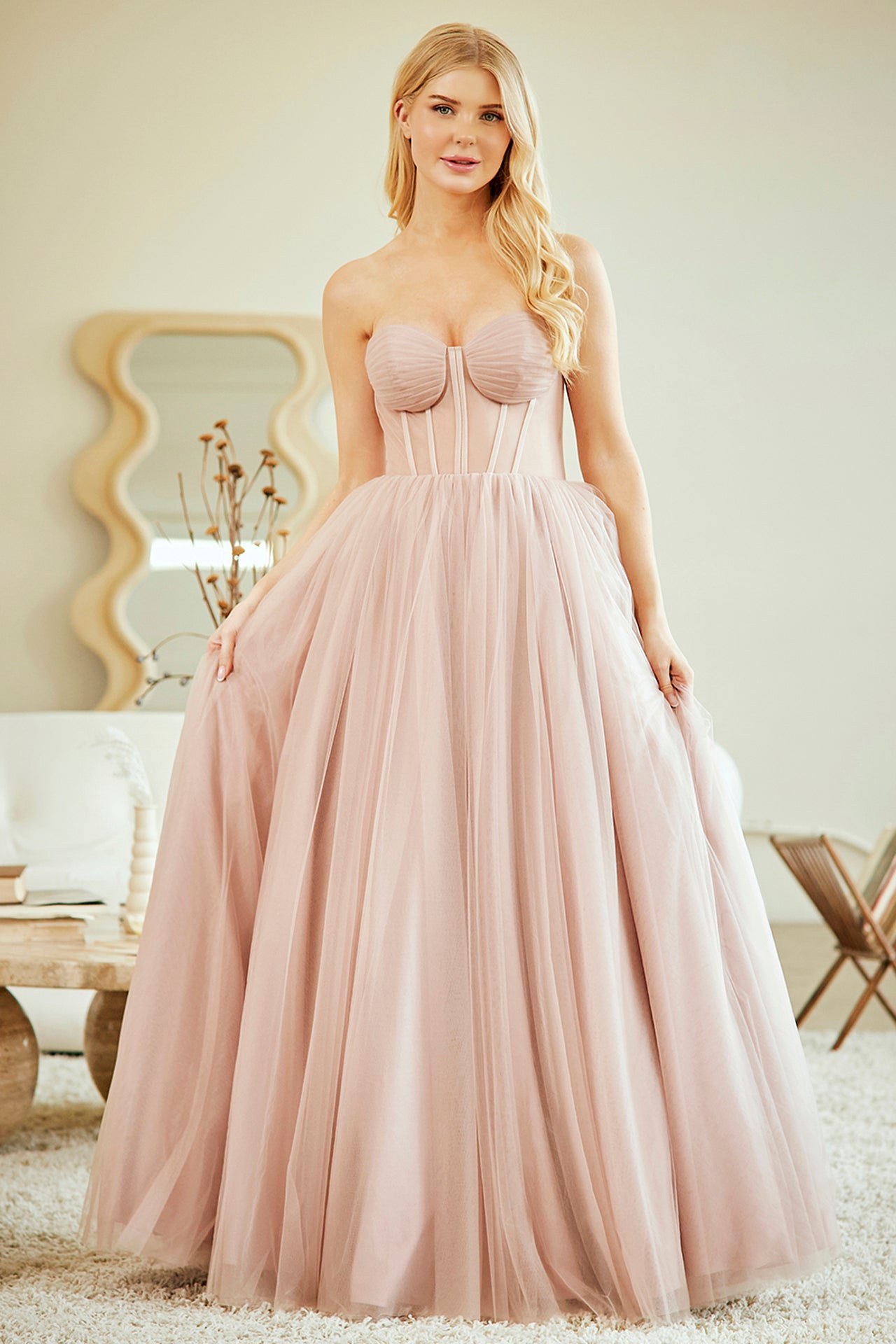 - Features: Pleated boned bodice