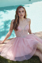 Charming Pearl Embellished Layered Baby Doll Prom Dress w/ Illusion V-Neck & Sheer Bodcie JT984S
