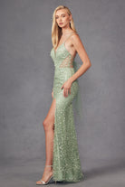 Plus, its long length, illusion V-neckline, and sleeveless design make it the perfect choice for any special occasion. Don't rely on guesswork, use the size chart and choose the perfect fit for you. Available in a stunning sage green color, this dress is sure to make you stand out in the crowd.
