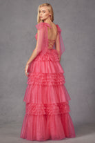 High-quality fabric construction ensures a comfortable and elegant fit. This stunning dress is designed with a V-neckline and an open corset back, exuding sophistication and charm. Its chic tiered ruffle skirt with tulle bows on the shoulder adds a touch of playfulness.