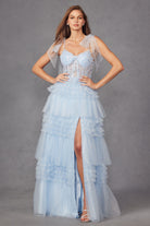Tiered Ruffle Skirt Tulle Bows On Shoulder Sleeve Long Prom Dress JTJT2465A