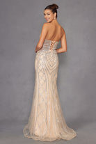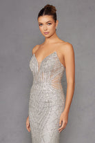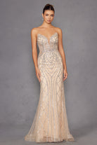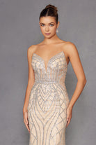 Make an unforgettable entrance in this ultra-glamorous long fitted gown, designed for the spotlight. This jaw-dropping style features a strapless illusion deep V-neckline with a sheer inset for support and structure, giving just the right touch of allure. The entire gown is adorned with intricate geometric beadwork and sequins, creating a dramatic art deco-inspired look that shimmers from every angle.