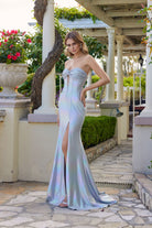 Strapless gown with a structured corset bodice featuring defined cup shaping and a twist-front detail. Fitted silhouette extends through the hips and flows into a flared hem with a subtle train. Front slit provides movement and a modern edge. Back features a clean, contoured line and hidden zipper closure for a smooth, secure fit. Designed for formal events, stage moments, and occasions that call for a standout look.