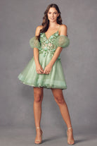 Sequin butterfly embroidered corset bodice with detachable sleeves short dress.