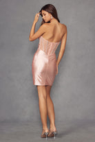 Strapless sweetheart neckline with a boned corset bodice creates an elegant silhouette that flatters and supports. This sleek bodycon dress features shimmering rhinestone accents that catch the light beautifully, paired with a convenient back zip closure for easy wear. The strategic leg slit adds graceful movement and modern allure to the classic silhouette. Expertly crafted for cocktail parties, galas, and upscale special occasions, this dress ensures you'll command attention with refined sophistication. The structured boning provides all-day comfort while maintaining a polished, put-together look that transitions seamlessly from evening events to memorable celebrations.