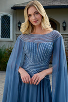 Designed for mothers who appreciate understated elegance, this mother of the bride or groom dress offers a timeless and sophisticated look. The scoop neckline is accented with linear jewel embellishments that extend seamlessly across the bodice, adding subtle sparkle. Flowing chiffon cape sleeves create soft movement, contrasting beautifully with the bodice. The A-line skirt is crafted from the same lightweight chiffon, ensuring a fluid drape and comfortable fit. Ideal for weddings and other special occasions, this gown delivers effortless refinement with classic appeal.