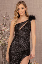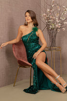 Sheer Bodice Sequin Mesh Mermaid w/ Feather on Shoulder Long Prom Dress GLGL3129