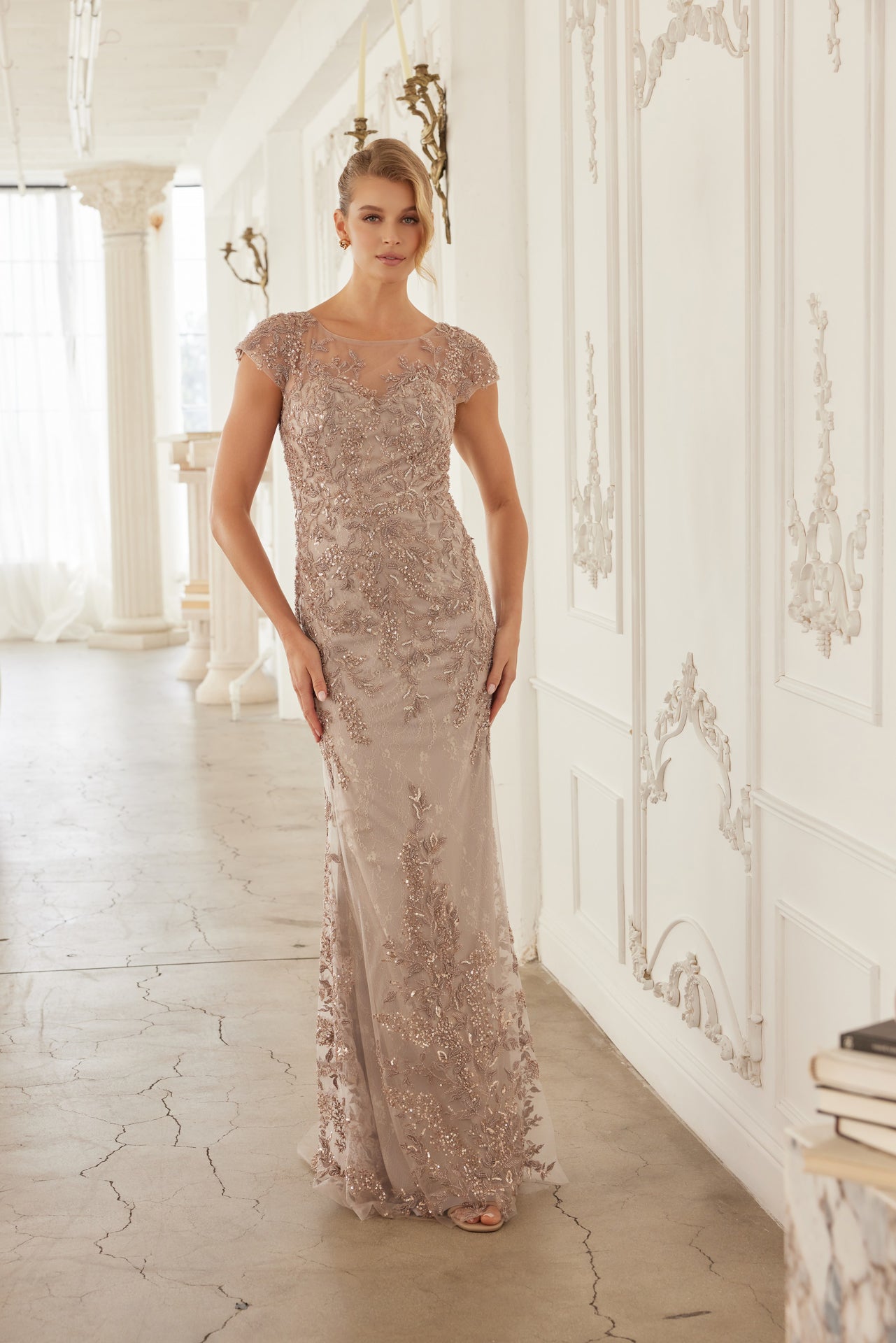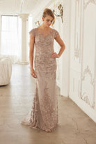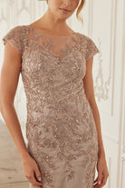 THIS ELEGANT MOTHER OF THE BRIDE DRESS FEATURES A LONG, FLOWING SILHOUETTE WITH SHORT SCOOP SLEEVES. THE ILLUSION NECKLINE AND BACK CREATE A SHEER, DELICATE EFFECT THAT ADDS AN ALLURING TOUCH. NO STRETCH!