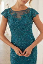 THE COMBINATION OF THE SLEEK, ILLUSION ELEMENTS AND THE STUNNING SEQUIN APPLIQUE RESULTS IN A TRULY REMARKABLE DRESS THAT IS PERFECT FOR A FORMAL OCCASION.