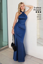 Turn heads in this luxurious satin party gown that seamlessly combines elegance with contemporary allure. The striking halter neckline commands attention while the sleeveless design showcases your shoulders with refined sophistication. Graceful fabric draping creates movement and dimension, adding an element of fluidity and grace to your silhouette. The mermaid cut hugs your curves beautifully before flaring dramatically at the hem, delivering a show-stopping effect with every step. An open back with secure zip closure provides modern flair and a daring touch of allure. The sumptuous satin fabric drapes luxuriously against your skin, ensuring both comfort and elegance throughout the evening. The long, floor-length length offers timeless formality perfect for upscale parties, cocktail galas, and special occasions where you want to feel absolutely captivating and confident.