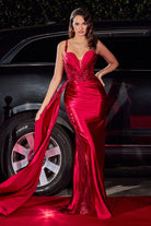 Emerald Green, Black, Ice Blue, Red Satin Illusion Gown with Beaded Bodice and Overskirt CDCDS417