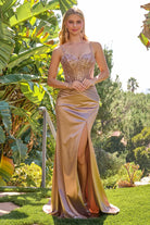 Radiate timeless elegance in this exquisite celebration dress, where delicate beaded and sequined spaghetti straps gracefully accentuate a sheer sweetheart corset bodice. Lavish embellishments adorning the bodice deliver a captivating shimmer and refined sparkle. Crafted from sumptuous stretch satin, the skirt cinches at the waist before unveiling sophisticated crossover pleats along the front and back for added texture and grace. The sculpted sheath design flows seamlessly into a striking thigh-high slit, merging sensuality with understated sophistication for an unforgettable evening silhouette.