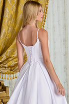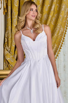 Understated elegance defines this minimalist A-line, satin wedding gown. Delicate spaghetti straps frame a flattering V-neckline, leading into a structured corset bodice with pleated detailing and a corset overlay for added dimension. The Basque waistline enhances the silhouette, flowing into a full A-line skirt with soft box pleats and a train. Perfect for the bride seeking a timeless silhouette with a clean, refined finish.