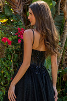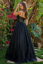 Step into the spotlight with this dazzling prom gown that balances sparkle and sophistication. Shimmery spaghetti straps frame a flattering V-neckline corset bodice, richly adorned with beads and jewels. The corset’s overlayer adds extra dimension with matching embellishments in addition to the sequins and delicate embroidery. Accentuating the Basque waistline, the decorations stop near the top of the skirt, leaving the A-line silhouette elegantly simplistic. A glittery underlayer throughout the gown adds shimmer and depth for a luminous finish.