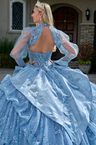 Command the room in this show-stopping quinceañera ball gown that transforms your celebration into an unforgettable moment. The strapless corset bodice features a flattering V-neckline adorned with sparkling beads, sequins, jewels, and intricate embroidery that catches light beautifully. A sculpted Basque waistline creates a stunning silhouette, flowing into a satin ruffle layer that extends dramatically in the back. Playful tulle bubble hem layers beneath add texture and movement, while shimmering glittering floral motifs dance across the skirt. The included coordinating long-sleeve bolero, embellished with dangling beads, offers versatility and added sophistication. This is the gown for the quinceañera who wants to feel absolutely radiant and unforgettable from the first moment to the last dance.
