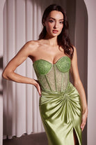 This fitted gown dazzles with a strapless sweetheart neckline and a sheer rhinestone-adorned bodice, adding a captivating shimmer to its elegant design. Crafted from soft satin, the gathered waistline and leg slit create a graceful silhouette, complemented by the supportive lace-up corset back. Perfect for prom or formal events, this dress brings together sophistication and modern glamour.