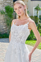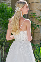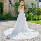 Exude timeless romance in this stunning wedding gown as you walk down the aisle. Adjustable spaghetti straps frame the boat neckline and support a structured corset bodice, intricately embellished with beads, embroidery, and sequins layered over delicate lace. The A-line skirt mirrors the bodice’s sparkle with matching embellishments atop a shimmering sequined underlayer, flowing elegantly into a sweeping train at the back.