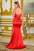 V neckline thin straps glitter underlayer bodice stretch satin skirt fitted dress with slit GLGL3694