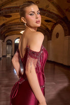 Sheath Off The Shoulder Soft Satin Dress w/ Structural Corset Bodice & Shoulder Fringe CDCD688
