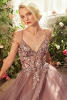 Mauve Tulle A-Line Gown with Floral Embroidery – Spaghetti Strap Prom & Formal Dress