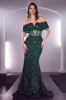 Black, Rose Gold, Emerald | Off-Shoulder Sequin Mermaid Dress with Sheer Corset Bodice CDCD985