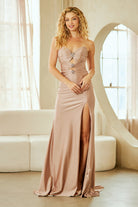 Dare to stand out in this audacious satin gown that merges timeless elegance with cutting-edge style. The lustrous fabric drapes beautifully across a sculpted bodice enhanced by strategic ruching and a romantic sweetheart neckline. A jeweled midriff keyhole cutout delivers pure sophistication with an edge, while the thigh-high slit commands attention with every step. Whether you're a bridesmaid or formal guest, this contemporary masterpiece offers the perfect balance of refined glamour and bold confidence for those ready to make a statement.