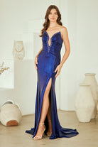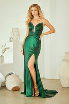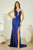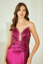 Make a bold statement in this stunning strapless prom gown that commands attention from every angle. The daring plunging neckline creates an alluring focal point, while the sleek sheath silhouette hugs your curves in all the right places. Intricate rhinestone embellishments cascade across the bodice and waistline, catching the light with every movement and adding glamorous sparkle to your special night. The gathered waistline provides flattering definition and a touch of architectural detail that elevates this design beyond the ordinary. Completely strapless for a modern, sophisticated look, this gown is engineered for those confident enough to turn heads.