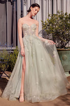 Command attention in this stunning sage green prom gown crafted from luxurious tulle. The romantic A-line silhouette flows gracefully while the sweetheart neckline frames your face with timeless elegance. Intricate floral appliqués and shimmering sequins create captivating dimension across the bodice and skirt. A daring leg slit adds modern sophistication and ease of movement. The strapless design showcases your shoulders, while a discreet zip closure ensures a seamless fit. Perfect for prom, formal galas, or any occasion demanding show-stopping glamour, this gown combines ethereal beauty with refined style.