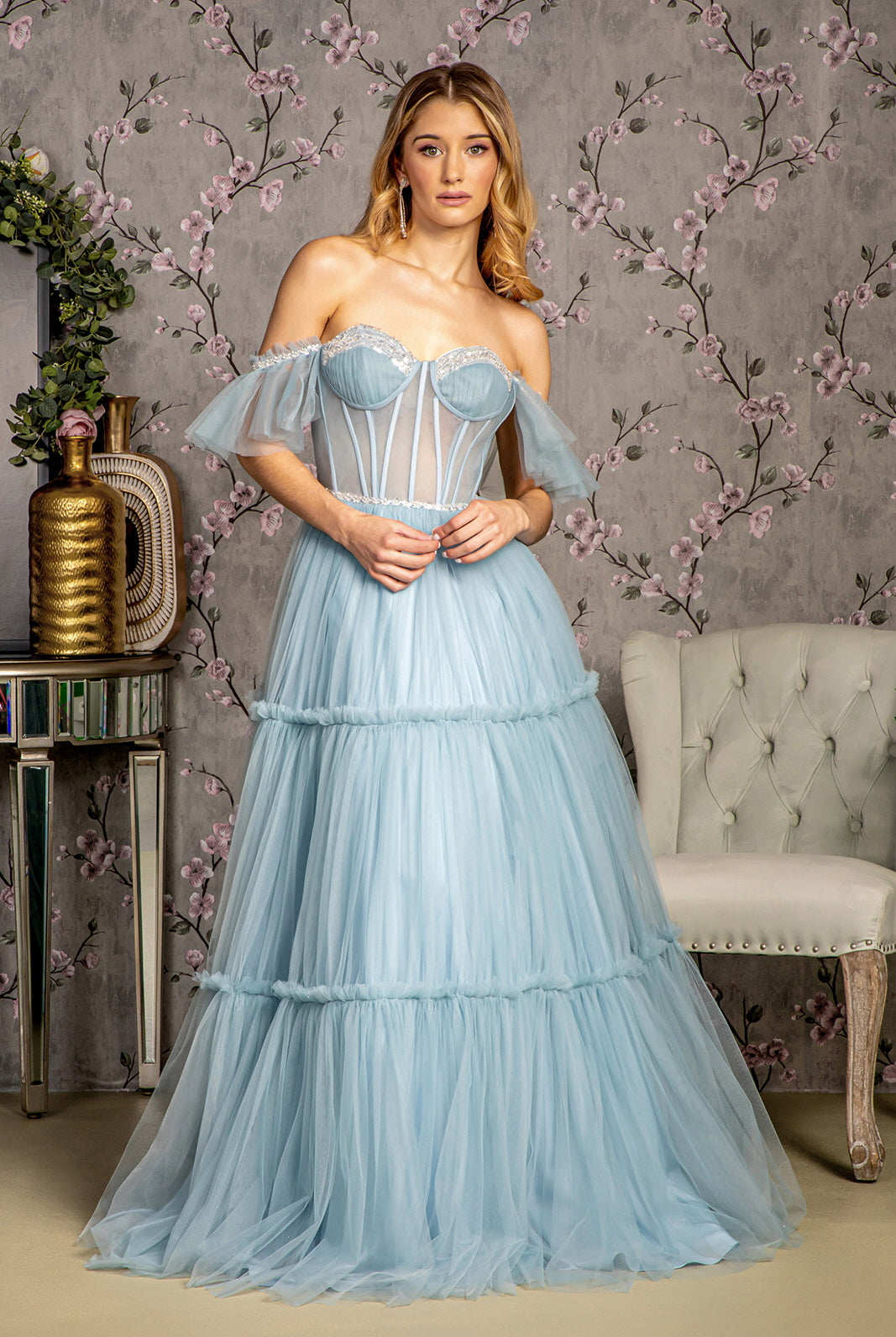 Glitter Embroidery Sheer Bodice Mesh w/ Long Puff Sleeves Long Ball Dress GLGL3476