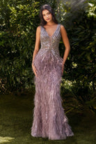 Beaded & Feather Fitted Illusion V-Neck Mermaid Long Prom Dress