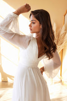 This elegant wedding dress features a plunging neckline and an open v-back, creating a stunning and feminine silhouette. The layered belt and chiffon fabric add a touch of luxuriousness, while the long sleeve design makes it perfect for any special occasion.