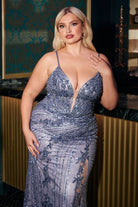 Plus Size Black Lace & Sequin Gown with Deep V-Neck and Tulle Overlay CDCC0389C