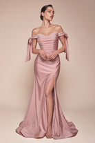 Plus Size Off-Shoulder Ruched Satin Gown with Slit – Curve-Hugging Elegance CDCD943C