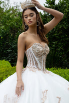 With a scallop edge, sweetheart neckline corset bodice that is strapless, and a floor-length skirt that has a train; this ball gown is embellished with sequins, embroidery, beads, and jewels.