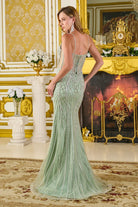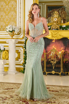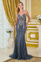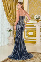 Sleek and sparkling, this fitted, floor-length evening dress is designed to make a lasting impression. The deep V-neckline corset bodice is supported by embellished spaghetti straps that add a touch of glamour. Shimmering jewels and beadwork form elegant line patterns across the entire silhouette, creating a figure-enhancing effect. A glitter mesh underlayer adds subtle sparkle from every angle, making this dress a standout choice for prom night or any formal occasion.