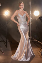 FITTED GLITTER & LACE STRETCH SATIN GOWN CDCDS450