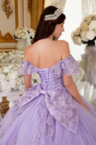 This sophisticated and elegant quinceanera & prom dress will flatter any body type. Available in blush and lavender color, the A-line silhouette features a sweetheart off-shoulder neckline, corset back tie, voluminous layered skirt, and delicate 3D floral appliqué.