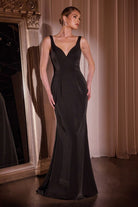 Embrace timeless elegance in this fit-and-flare crepe gown, featuring a flattering V-neckline and strapless sleeveless design. The removable long-sleeve jacket, adorned with a crystal floral motif, adds a touch of glamour and versatility. Perfect for mothers of the bride or formal events, this ensemble combines sophisticated style with graceful charm.