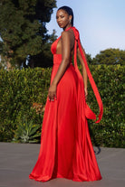 Coral, Red, Emerald, Black | Satin Halter Gown with Keyhole Cutout, Open Back & High Slit CDCD323