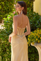 Jewel accent sweetheart neckline mesh corset ruched detail slit jersey skirt dress GLGL3539