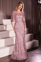 Gold Sequin Lace Evening Gown with Elbow Sleeves