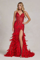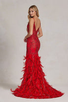 Embellished Feather Skirt V-Neck Open V-Back Side Slit Long Prom Dress NXC1119