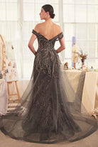 Dark Silver Off-Shoulder Sequin Gown with Tulle Overlay and High Slit – Glamorous Evening Dress