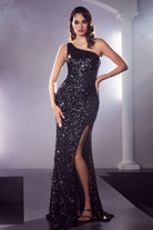 Black Sequin One-Shoulder Gown with High Slit CDCH118