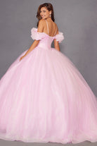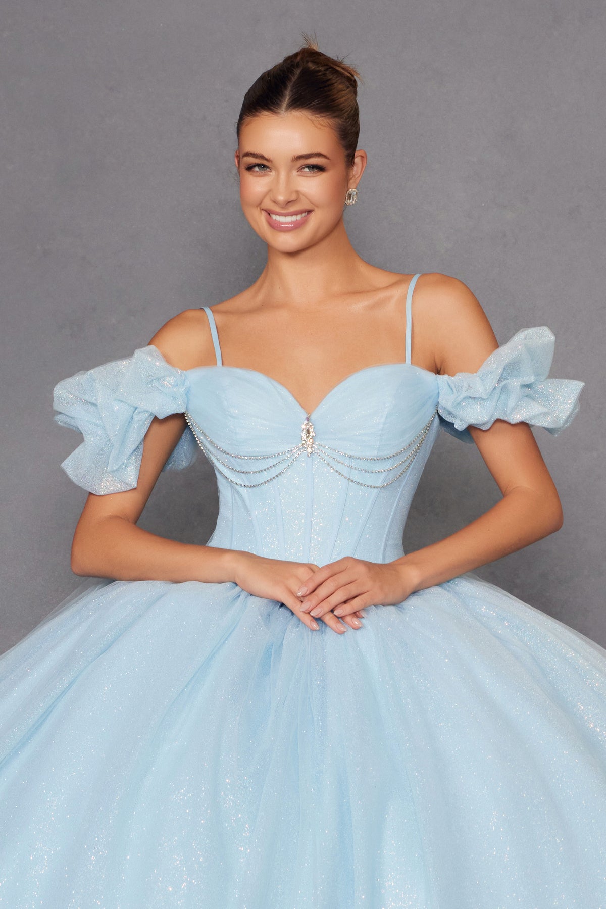 This beautiful quinceañera dress exudes a princess-like charm, perfect for making a grand entrance. The gown features a fitted bodice with a sweetheart neckline, adding a touch of romance and elegance. The bodice is adorned with intricate sparkling embellishments, creating a dazzling effect that catches the light beautifully. Below the bust, there are delicate jewels hanging, adding an extra layer of sophistication and sparkle to the dress. Off-the-shoulder sleeves made of sheer fabric add an ethereal and delicate touch, enhancing the overall fairy-tale aesthetic. The full skirt extends into a wide, floor-length silhouette, crafted from layers of soft, flowing fabric that create a voluminous and graceful look. The skirt is also embellished with shimmering details, adding to the dress’s enchanting appeal. Ideal for a quinceañera celebration, this dress combines classic elegance with modern sparkle, making it a perfect choice for a young woman stepping into her special day.