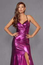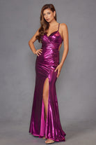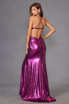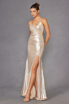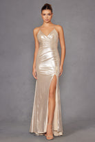 " Elevate your evening wear with this stunning metallic dress. This piece features a halter neckline that gracefully transitions into a sleek, sleeveless design, accentuating the shoulders and allowing for an elegant display of the collarbones. The top is artfully ruched, creating texture and enhancing the silhouette, while the cinched waistline flatters the figure. The luxurious fabric cascades down into a flowing skirt with a daring thigh-high slit. The back of the dress is equally captivating, with crisscrossing straps that add a modern twist and a gathered design at the lower back, creating flattering ruching that enhances your curves. This dress is tailored to perfection with a smooth lining for comfort, ensuring you look and feel fabulous throughout any event."