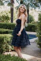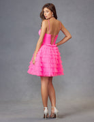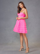 The ruffled tulle and keeyhole bodice add a touch of femininity, and the corset back provides a flattering fit. Available in black and neon pink, this dress is perfect for special occasions and events.