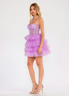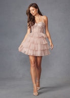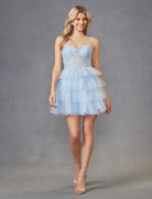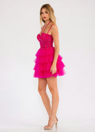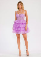 Elevate your special occasion look with our stunning Leaf Lace Corset Ruffle Tulle Skirt Short Cocktail Dress. Made from 100% Polyester, this dress is available in Buff, Fushsia, Light Blue, and Lilac, giving you a variety of color options to choose from.